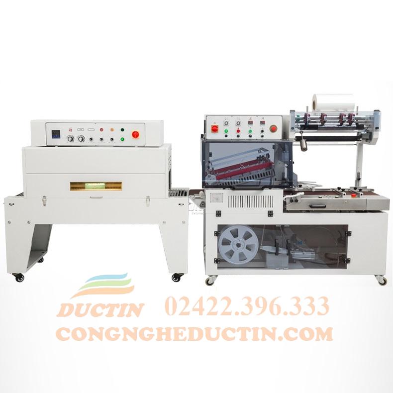 Cả 2 máy đặt liên hoàn và hoạt động đồng bộ với nhau. Sản phẩm sau khi cắt màng xong sẽ chạy sang máy co và co lại.