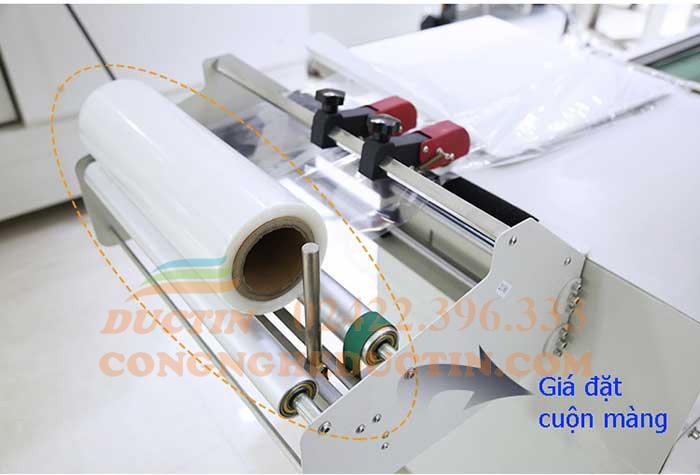 - Giá đặt màng co gồm các con lăn bằng hợp kim, có các thanh chặn để giữ 2 đầu cuộn màng. Trên giá có bộ phận đục lỗ màng co, giúp màng không bị nổ trong quá trình co.