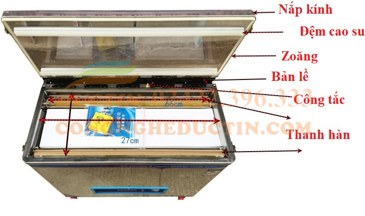 - Nắp buồng hút của máy rất dầy, bằng mê ka, giúp bạn dễ dàng quan sát sản phẩm không khi đang hút.