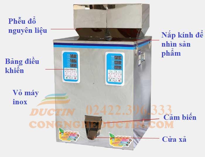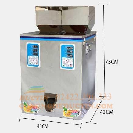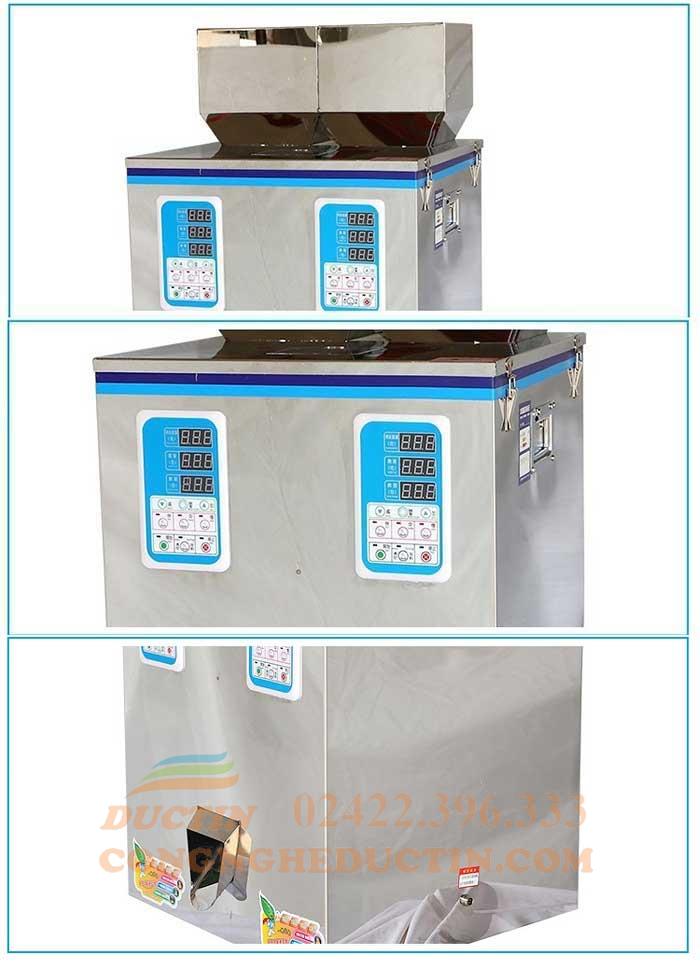 - Máy định lượng sản phẩm bằng phương pháp rung và các cảm biến giống như cân định lượng 3 đầu. Khi đổ nguyên liệu vào phễu và cài đặt trọng lượng, máy sẽ rung để sản phẩm rơi xuống đường ống dẫn.